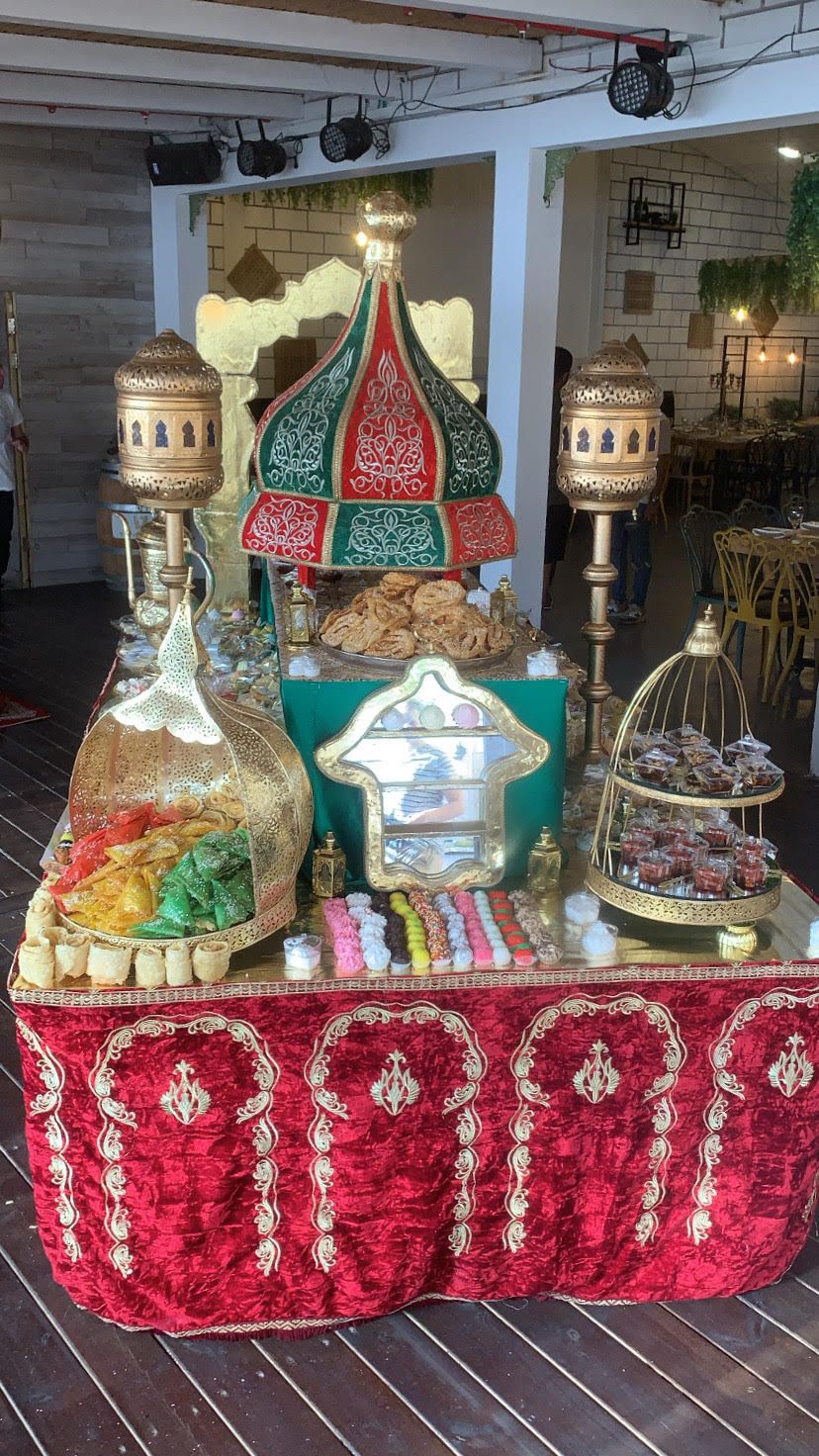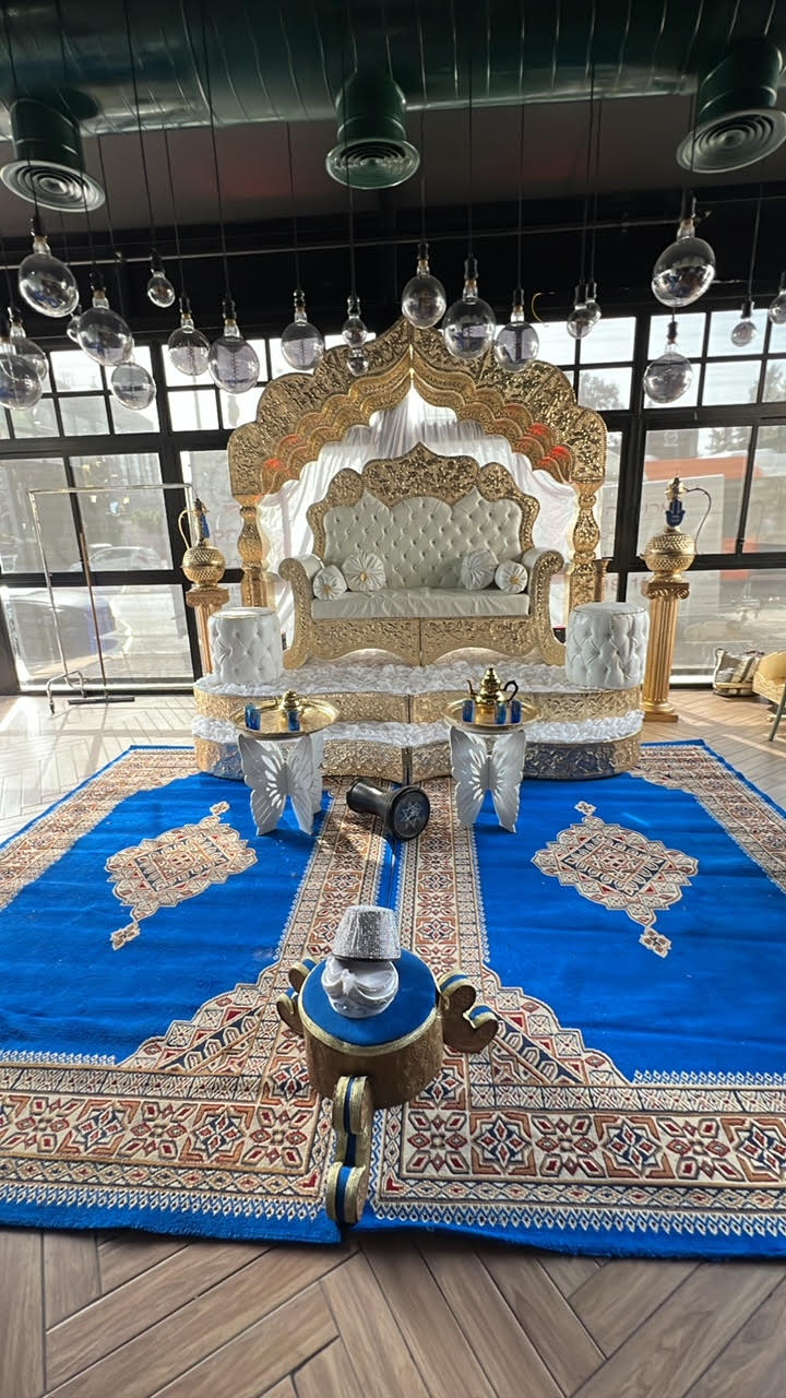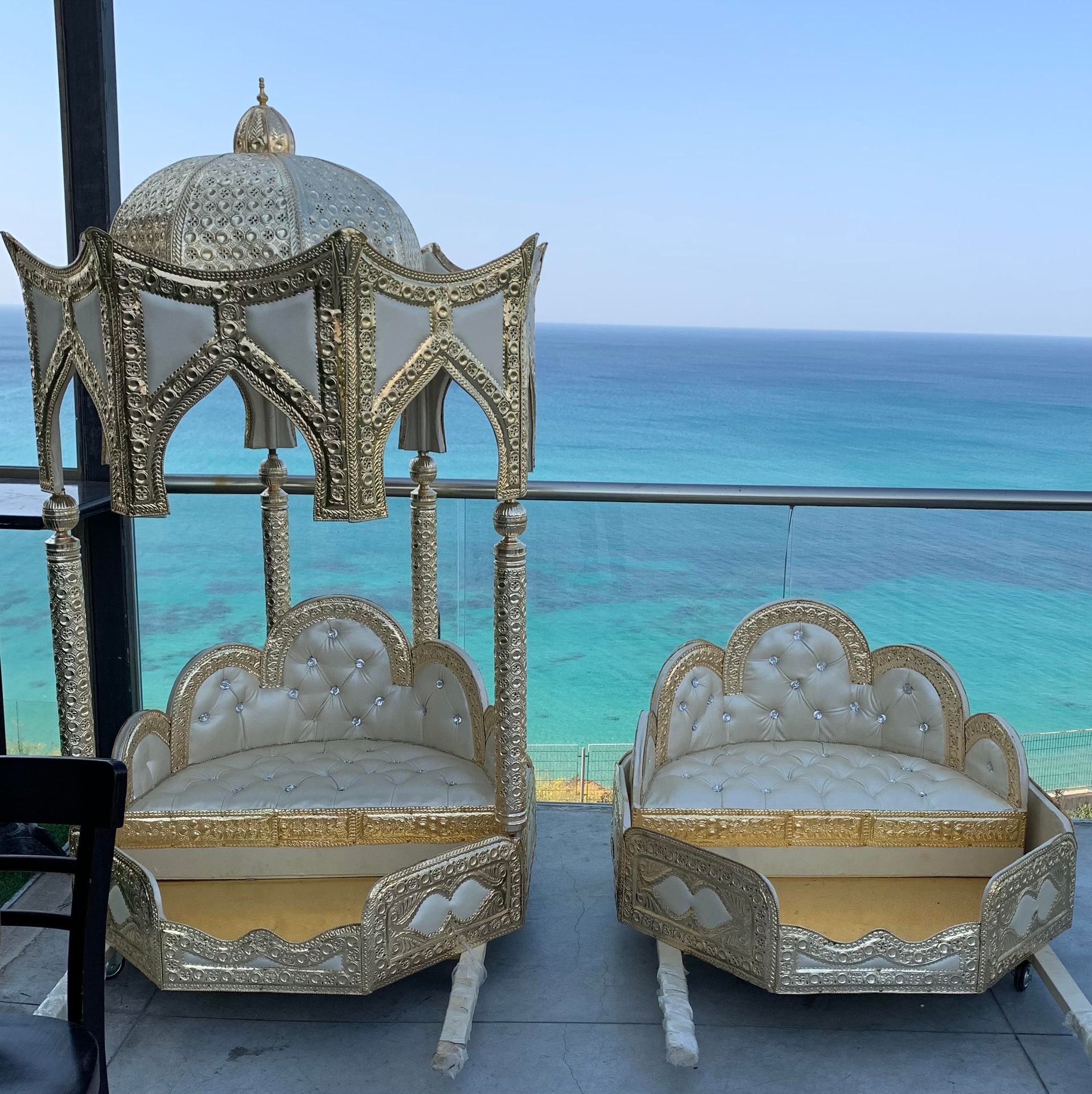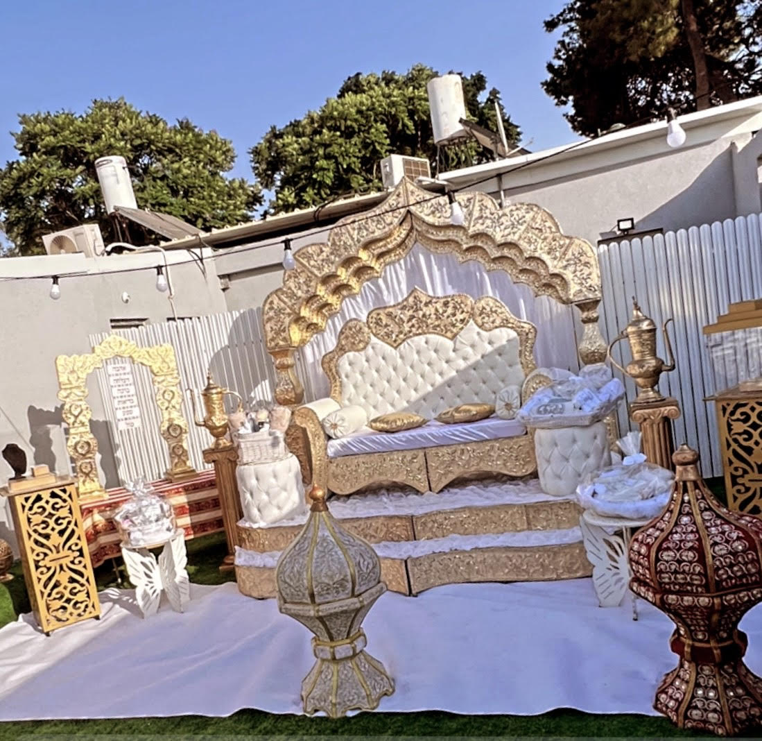 אנו מציעים מגוון רחב של סגנונות תפאורה וטלמונים (ספה מלכותית לזוג) בגדלים שונים וצבעים שונים , בנוסף בעת הכניסה לטקס חינה אנו מציעים מגוון של אפריונים שאיתם מרימים את הזוג המלכותי ומוליכים אותם בריקודים לאוהל החינה, כמובן תלבושות מפוארים לכלה והחתן (אופציה לתפירה אישית)